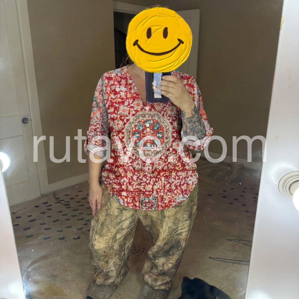 This blouse is a wearable celebration of bohemian artistry. The vibrant red base, printed with intricate ethnic-inspired geometric motifs, makes a bold statement.