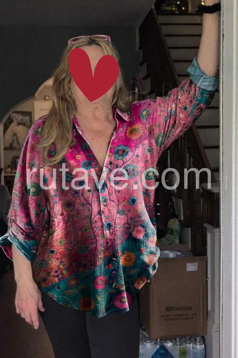 This long-sleeve shirt features a colorful floral print with a bold purple and teal color block design. The relaxed fit and classic collar offer effortless style. Perfect for pairing with jeans or denim shorts. Ideal for bohemian-inspired looks. Lightweight and eye-catching for casual days.
