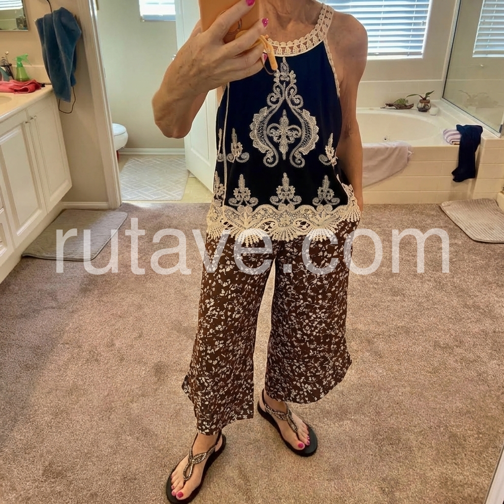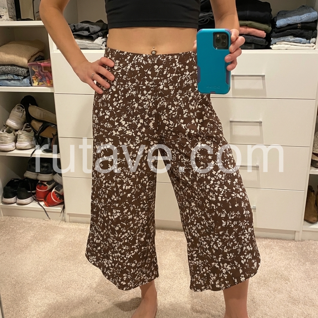 These high-waisted culottes feature a delicate white floral print on a rich brown base. Wide-leg design with an asymmetrical hem for a stylish flair. Elastic waistband for comfort and ease. Lightweight fabric perfect for warm weather. Ideal for casual outings or boho-chic looks.