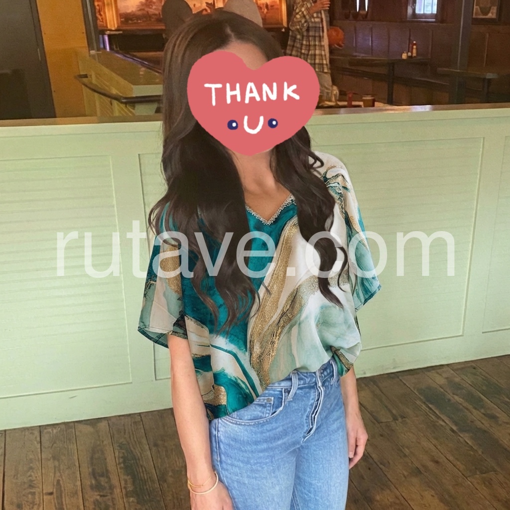 This loose-fitting top features a bold emerald, gold, and cream abstract design. V-neckline with delicate trim for added detail. Wide sleeves and relaxed silhouette for effortless comfort. Perfect for warm days or beachwear. Stylish and easy to pair with pants or shorts.
