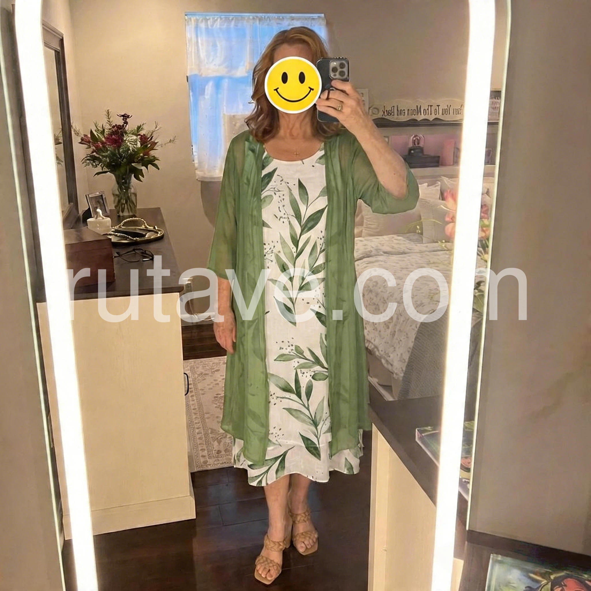 Green Leaf Print Dress Cardigan Two Piece Set