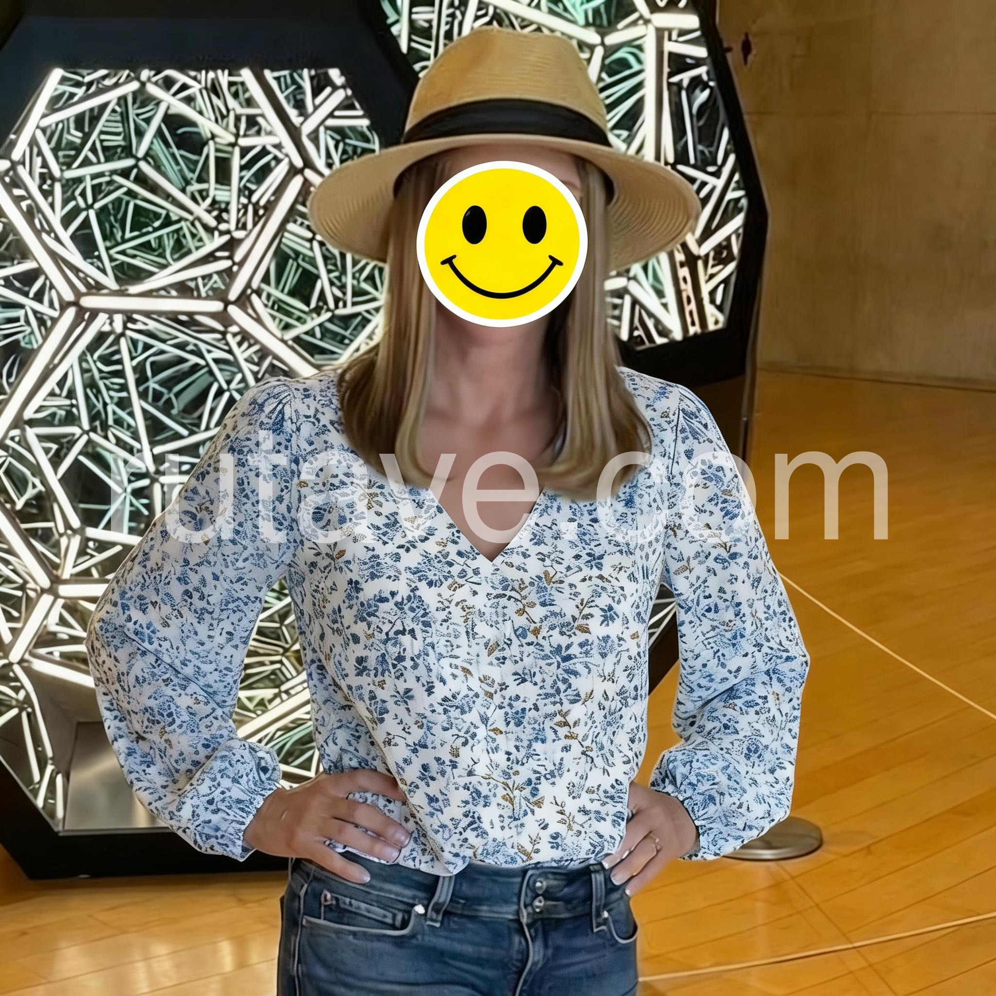 This V-neck top features a delicate blue floral print on a soft white base. Long puff sleeves with gathered cuffs add feminine flair. Lightweight fabric perfect for spring and summer. Pair with jeans or high-waisted pants for a stylish look. Effortlessly elegant with vintage charm.
