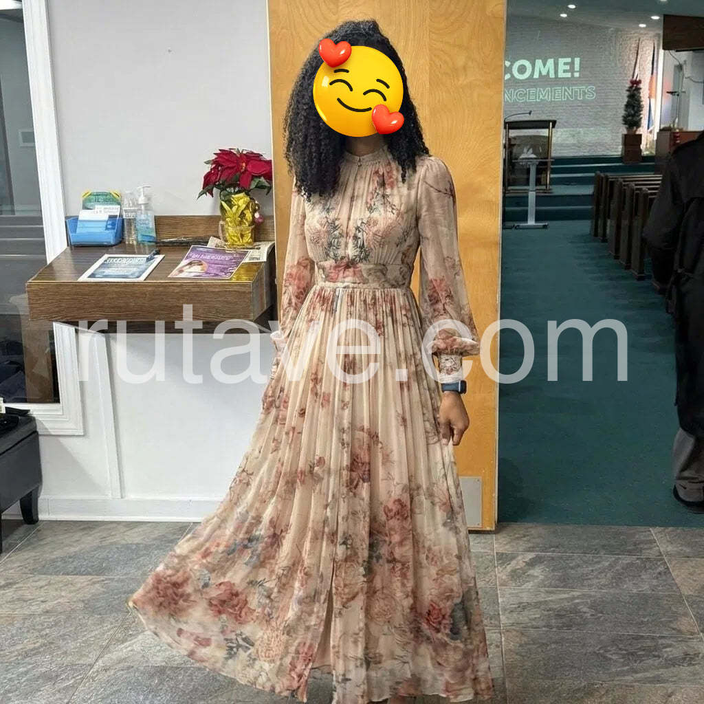 Crafted from lightweight chiffon, this vintage-inspired maxi dress features an elegant floral print that captures timeless sophistication. The flowing silhouette and long sleeves provide graceful coverage while maintaining breathable comfort, making it ideal for both casual outings and special occasions. The maxi length creates an elongated, flattering line that works across various body types. Perfect for layering or wearing solo, this piece seamlessly transitions from day to evening wear with its versatile design and classic aesthetic.