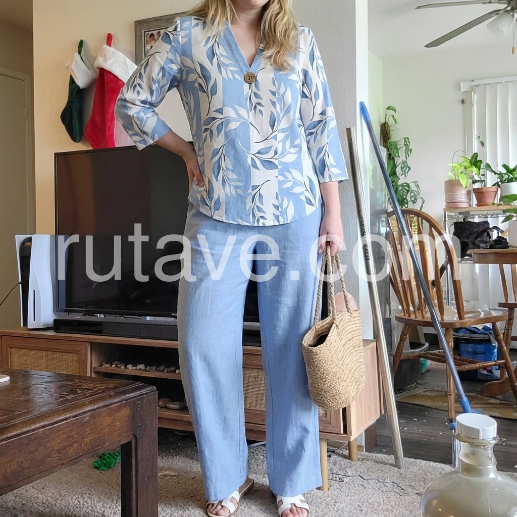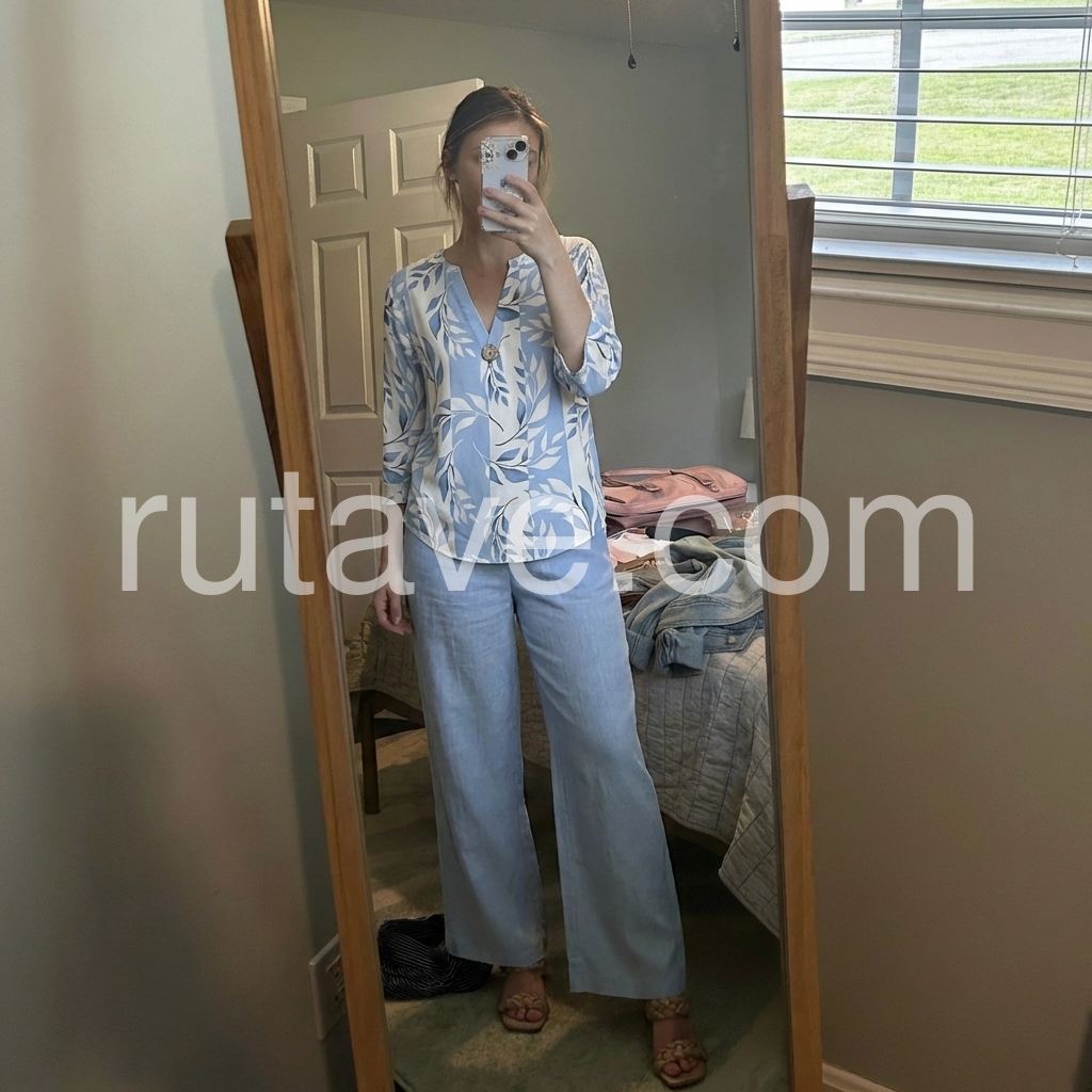 Hey fashionistas! This two-piece set is a total game-changer. The V-neck top with blue and white prints is super flattering, while the three-quarter sleeves add a touch of elegance.