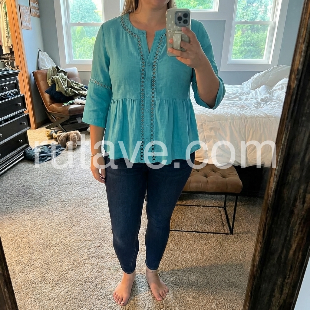 This loose-fit top features a vibrant teal hue with delicate eyelet cutouts along the neckline and sleeves. Button-down front and flared hem add a feminine touch. Three-quarter sleeves offer comfort and style. Lightweight fabric perfect for warm weather. Effortlessly chic with a relaxed, bohemian vibe.