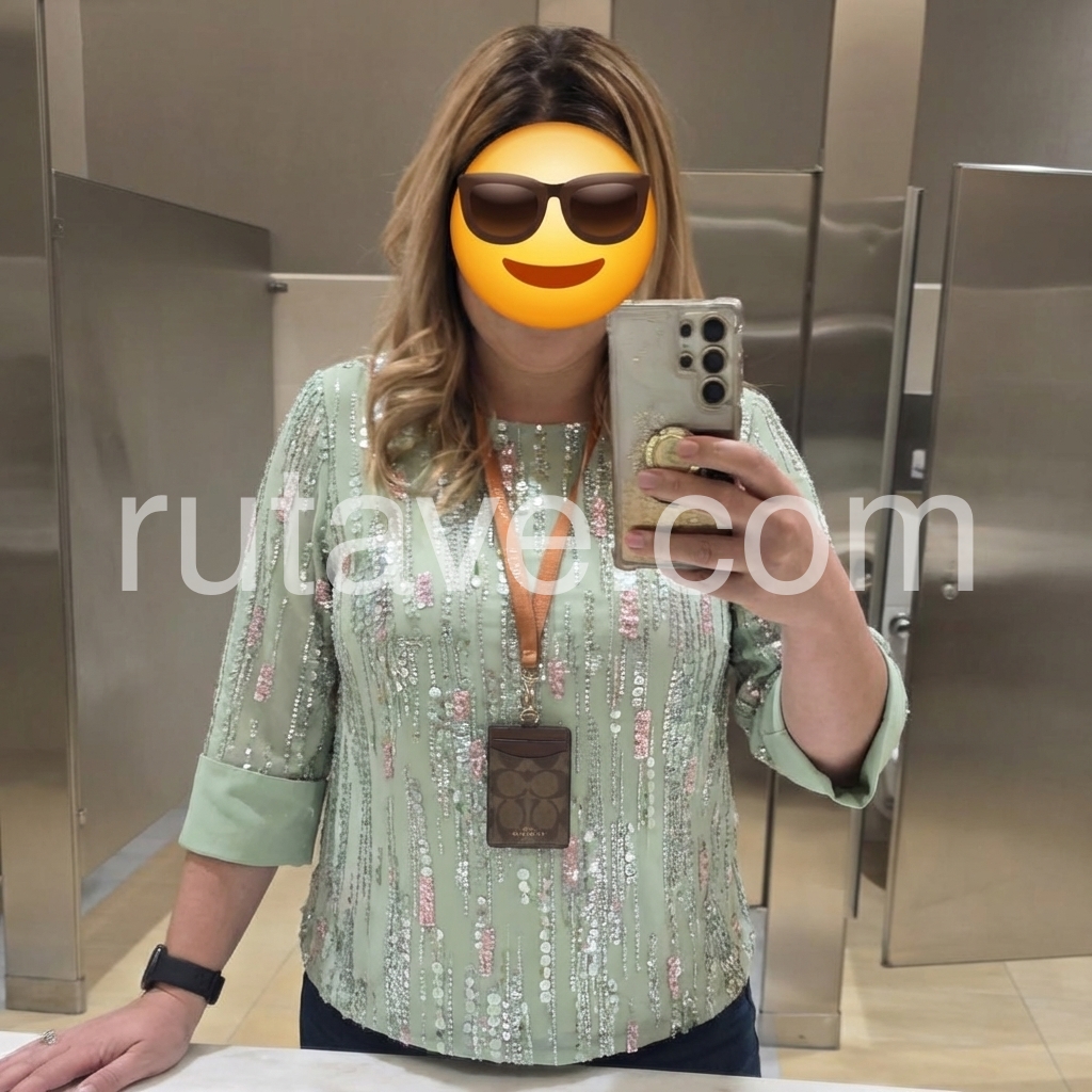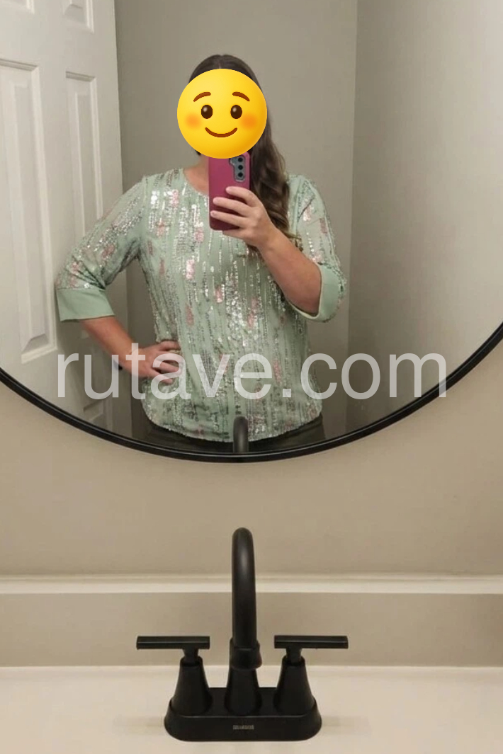This three-quarter sleeve top features a soft mint green base with vertical sequin and bead detailing. The round neckline offers a classic, flattering look. Lightweight fabric perfect for special occasions or evening wear. Pair with pants or a skirt for a polished outfit. Effortlessly glamorous with a touch of sparkle.