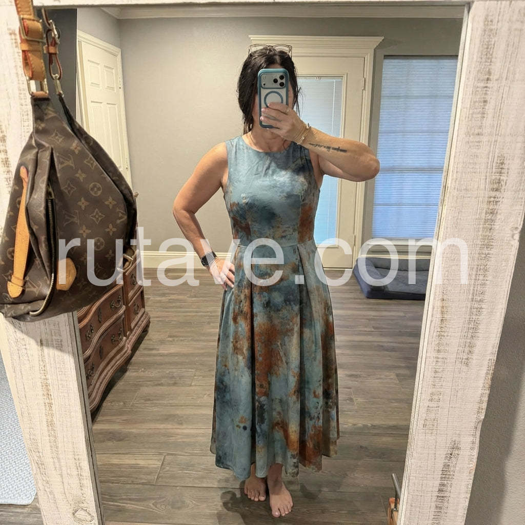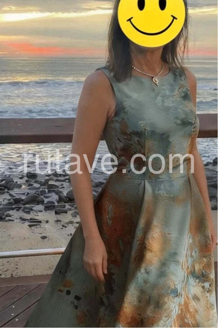 Style# 1544166This stunning sleeveless midi dress features a bold abstract print with a harmonious blend of soft blue, earthy rust, and muted gold tones, reminiscent of a watercolor masterpiece. Crafted from luxurious, structured fabric, the dress boasts a flattering high-neck design and a tailored fit through the bodice that elegantly flares into an A-line skirt, creating a graceful silhouette. The mid-calf length adds timeless sophistication, making it perfect for cocktail parties, weddings, or upscale evening events. Paired with delicate heels and a sleek clutch, this dress exudes refined elegance and artistic flair—ideal for those who appreciate fashion with a touch of modern artistry.