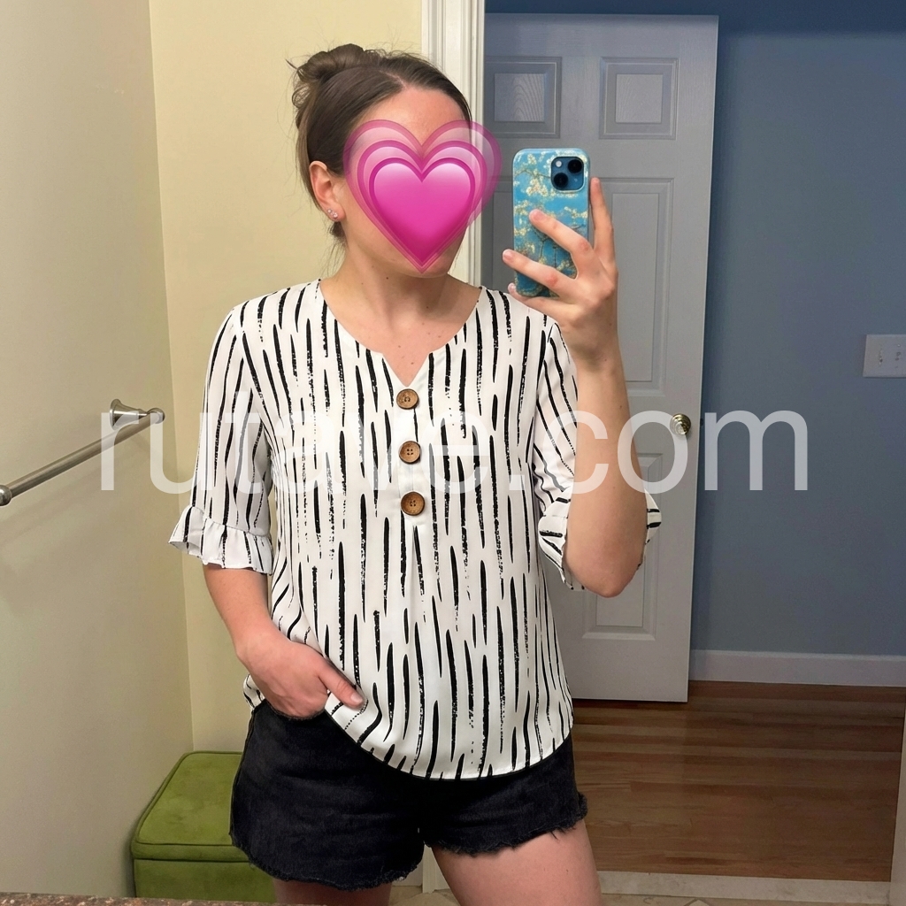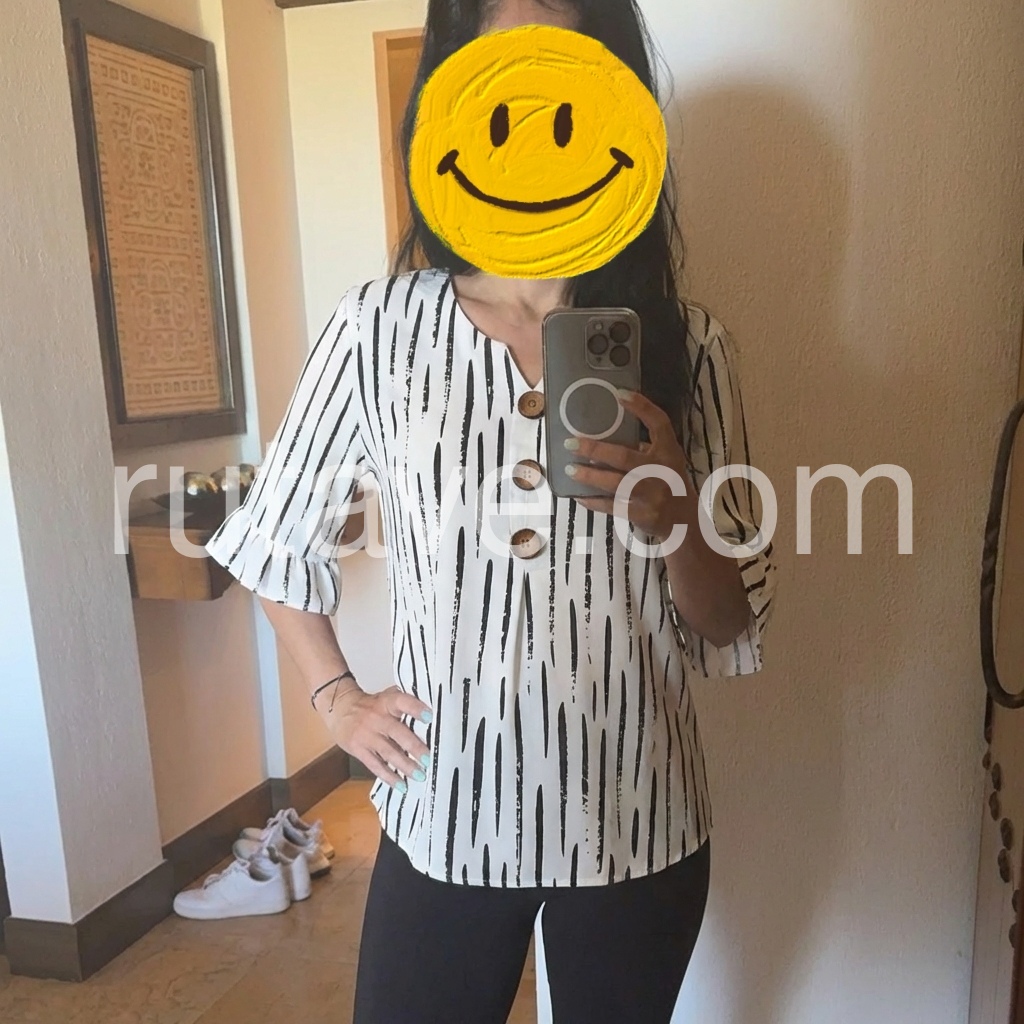 This loose-fitting top features a bold black abstract stripe print on white. V-neckline with wooden buttons down the front. Three-quarter sleeves with ruffled cuffs for a feminine touch. Lightweight and breathable, perfect for casual wear. Easy to pair with jeans or pants.