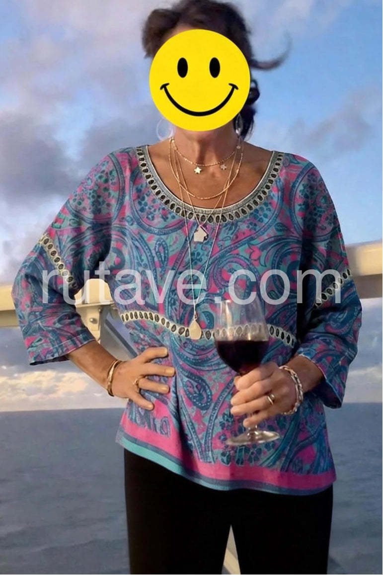 Style# 1544326Embrace free-spirited fashion with this Special Paisley Print Round Neck Top, a bold and artistic statement piece that brings vibrant energy to any outfit. Crafted from soft, lightweight fabric—likely cotton or rayon blend—this relaxed-fit tunic features an eye-catching paisley pattern in rich shades of deep purple, teal, and fuchsia, accented with intricate tribal-inspired motifs. The design is elevated by delicate black circular trim along the neckline, sleeves, and waistband, adding a touch of bohemian flair and contrast. With its three-quarter sleeves and slightly asymmetrical hem, this top drapes beautifully over jeans, leggings, or skirts, making it perfect for casual outings, music festivals, or weekend adventures. Layer it with layered necklaces, bracelets, and sandals for a full-on boho look—just like in this Lulus-inspired ensemble. Ideal for those who love expressive prints and effortless style, this tunic combines comfort, color, and cultural artistry into one wearable masterpiece. A must-have for anyone craving a touch of wanderlust in their wardrobe.