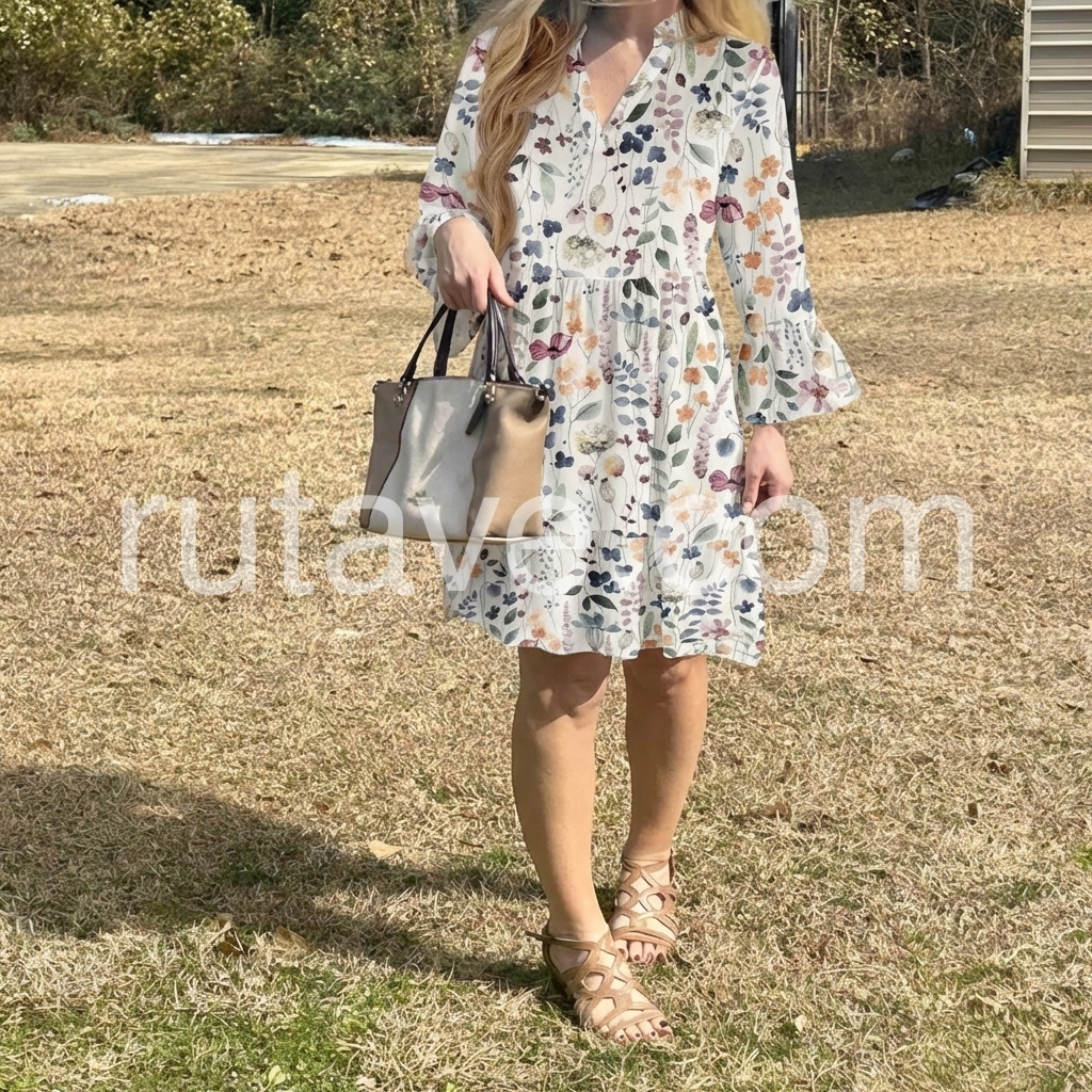 This white floral dress features a V-neck, button-down front, and flared bell sleeves. The tiered skirt adds movement and charm. Soft pastel blooms create a delicate, summery look. Perfect for beach days or casual outings. Lightweight and effortlessly feminine.