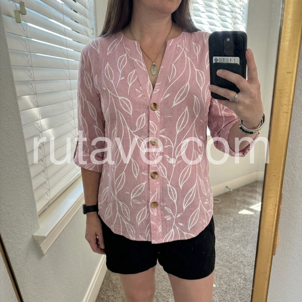 Pink Leaf Print Button-Down Casual Blouse