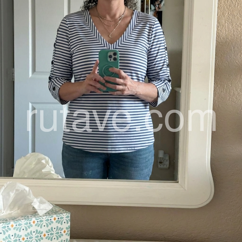 Style# 1547735As a fashion editor, I love how this top reimagines the classic stripe with modern flair. The deep V-neck flatters every face shape, while the three-quarter sleeves with button accents solve the common issue of “boring basics” by adding subtle visual interest.