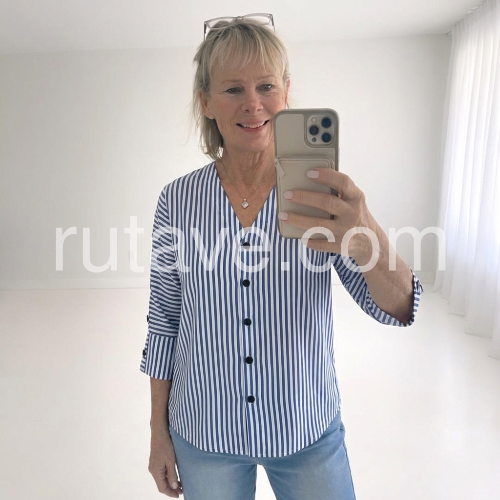 Style# 1545061Effortless elegance meets everyday versatility in this timeless striped blouse. The flattering V-neckline draws the eye upward, while crisp vertical blue and white stripes create a refined, elongating silhouette. Crafted from a breathable cotton-elastane blend, the three-quarter sleeves feature charming side button details that elevate the design beyond the ordinary. Slip it on for weekend brunch, office meetings, or casual dinners—this piece transitions seamlessly across your week. The lightweight fabric moves with you, never constraining, always comfortable. Pair with tailored trousers for polished sophistication or your favorite jeans for relaxed chic. This is the blouse you'll reach for again and again. Make it yours today.