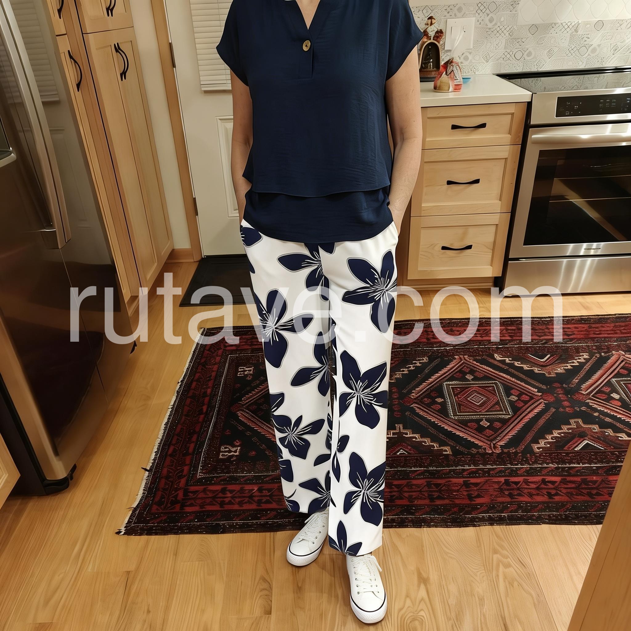 This coordinated set features a relaxed navy top with a layered hem and a single-button detail. Paired with white pants in bold navy floral prints for a beach-ready look. Lightweight fabric perfect for warm weather. Ideal for resort wear or casual outings. Effortlessly elegant and easy to style.