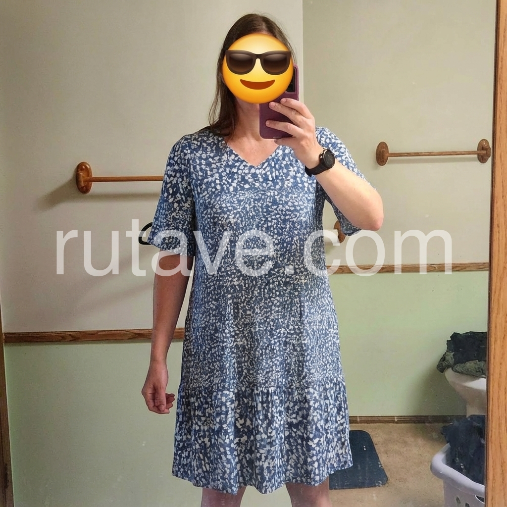 Adorned with a charming blue-and-white floral print, it brings a fresh, vintage vibe to your wardrobe. The subtle tiered hem adds gentle movement.