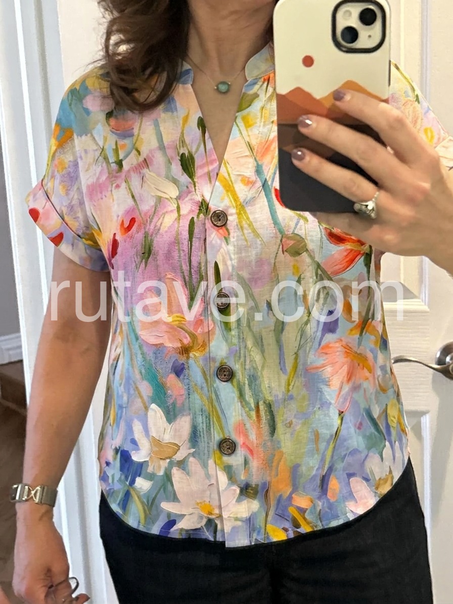 Style# 1544521Elevate your seasonal wardrobe with this Chic Watercolor Floral Print Short Sleeve Top, a dreamy and artistic top that captures the essence of blooming spring. Crafted from lightweight, breathable fabric—likely cotton or rayon blend—this short-sleeve blouse features a delicate watercolor-inspired print in soft pastel hues of blush pink, lavender, peach, and sky blue, accented with hints of green and gold. The floral design flows across the fabric like a painted garden, creating a romantic and effortless look. A classic V-neckline and front button closure add structure and versatility, while the relaxed fit ensures comfort and ease. Perfectly paired with jeans, high-waisted shorts, or flowy pants, it’s ideal for casual outings, weekend brunches, or warm-weather strolls. Styled here with layered necklaces and a sleek watch, it blends boho charm with modern simplicity. Let this floral blouse bring a touch of gentle elegance and vibrant color to your everyday style.