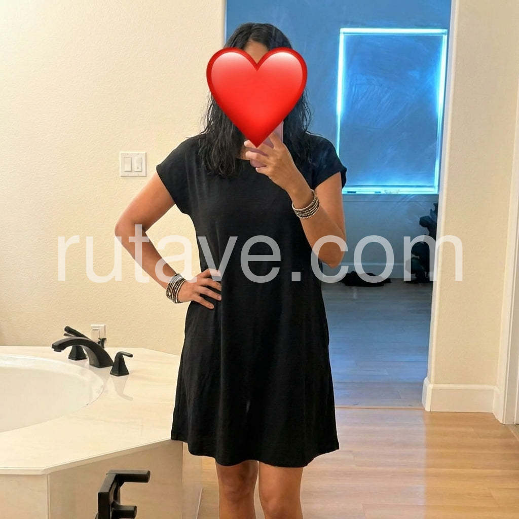 Style# 1544151This chic and versatile black t-shirt dress offers the perfect blend of comfort and style for casual days. Featuring a relaxed, A-line silhouette with a round neckline and short cap sleeves, it provides a flattering and easy-to-wear look. The soft, lightweight fabric drapes beautifully, making it ideal for lounging at home, running errands, or casual outings. Two spacious side pockets add both functionality and a subtle detail to the minimalist design. The slightly asymmetrical hemline adds a modern touch, enhancing its effortless appeal. Pair it with sandals, sneakers, or boots depending on the occasion—this timeless piece is a wardrobe staple for anyone who values simplicity, comfort, and understated elegance. Perfect for summer days, travel, or cozy weekends.