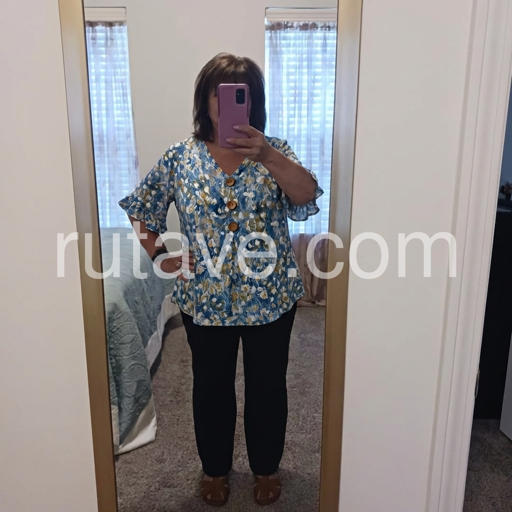 Inspired by oil painting art, this blouse features romantic blue floral prints and ruffle 3/4 sleeves. Soft, flowy fabric ensures a light, comfortable fit.