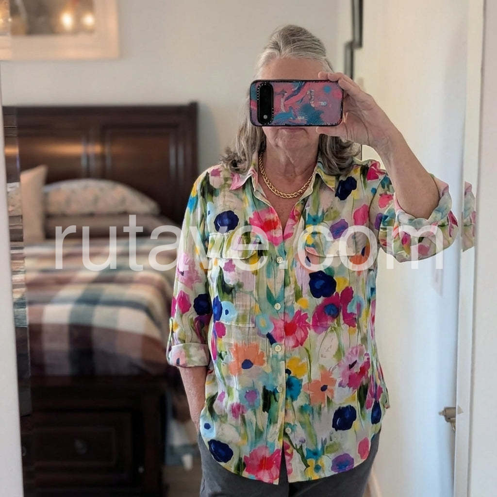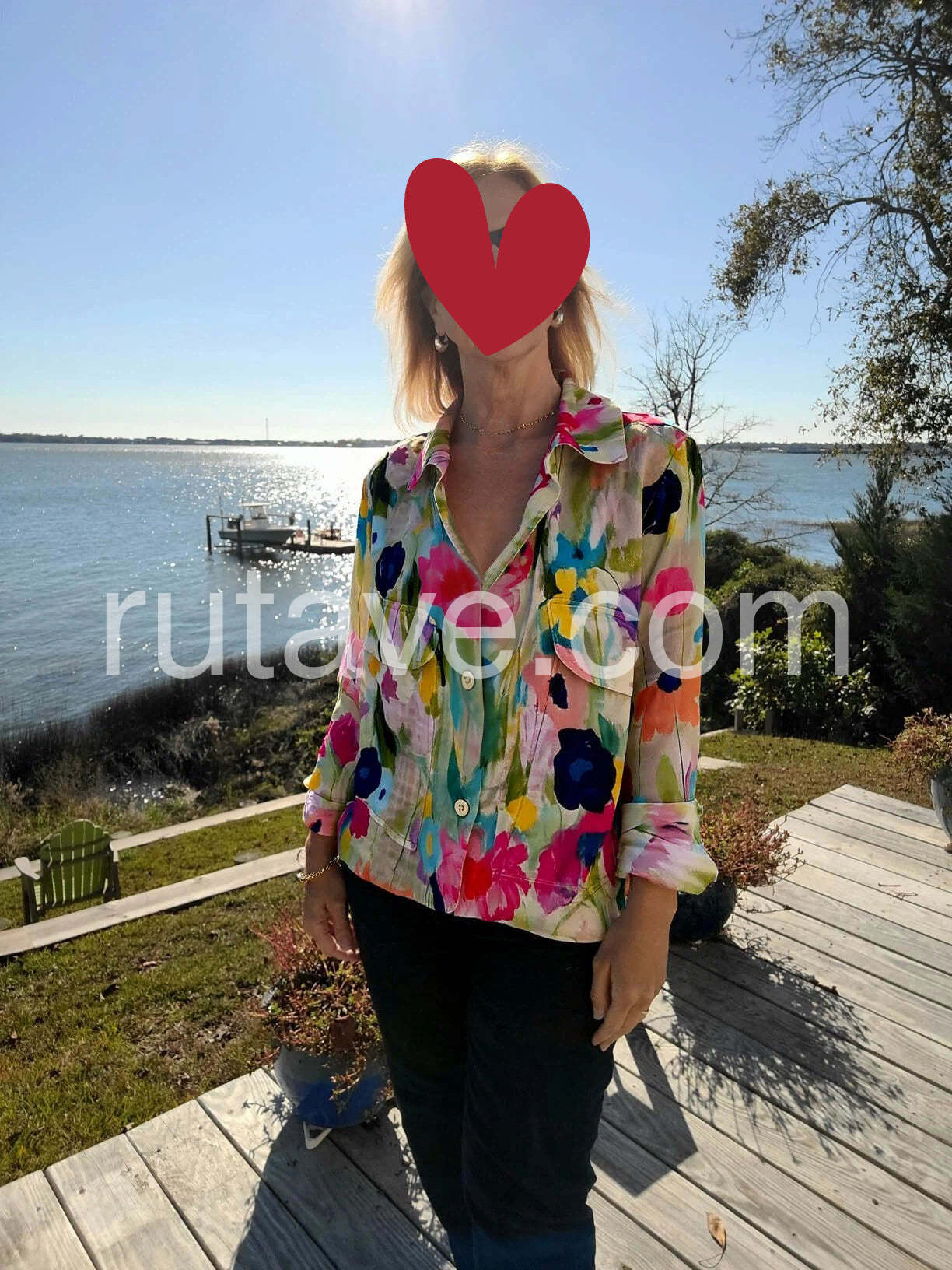 Style# 1544491Make a statement in this Vibrant Watercolor Floral Shirt, a lively and artistic blouse that brings bold color and expressive flair to your wardrobe. Crafted from lightweight, fluid fabric—likely silk or satin blend—this long-sleeve button-up features a dynamic watercolor-inspired floral print in rich shades of pink, fuchsia, cobalt blue, emerald green, and sunny yellow, creating a painterly effect that feels both modern and romantic. The classic shirt silhouette includes a collared neckline, front button closure, and two chest pockets that add structure and charm. Rolled sleeves offer a relaxed, effortless look perfect for warm-weather days. Paired here with a shimmering sequin skirt and gold accessories, it effortlessly blends boho elegance with glamor. Ideal for summer outings, beachside dinners, or festive occasions, this floral blouse adds energy, personality, and a touch of artistic flair to any outfit. Let its vibrant hues and fluid design turn heads wherever you go.