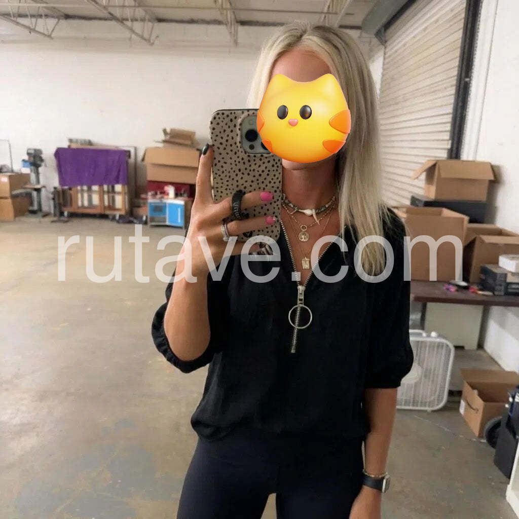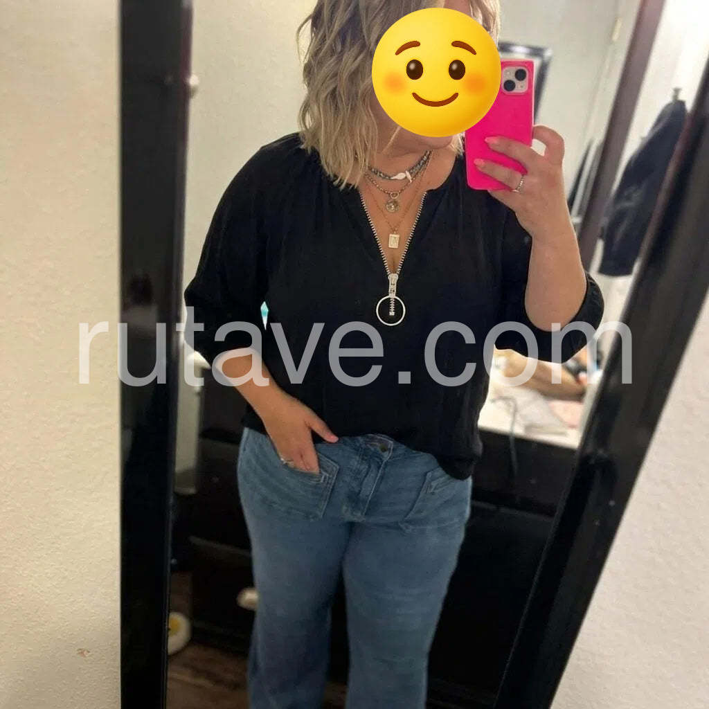 This versatile black zip-up top features a classic V-neckline and clean, minimalist design that transitions seamlessly from casual to professional settings. The full-length zipper allows for easy layering and temperature control, making it an essential wardrobe staple. Crafted in a neutral shade, it pairs effortlessly with virtually any outfit in your collection. The structured fit provides a polished silhouette while maintaining comfort for all-day wear.